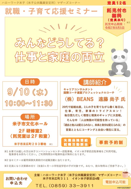 今年も、マザーズハローワークのセミナーを遠藤尚子が担当させていただきます。