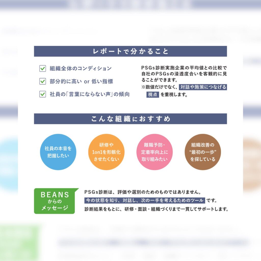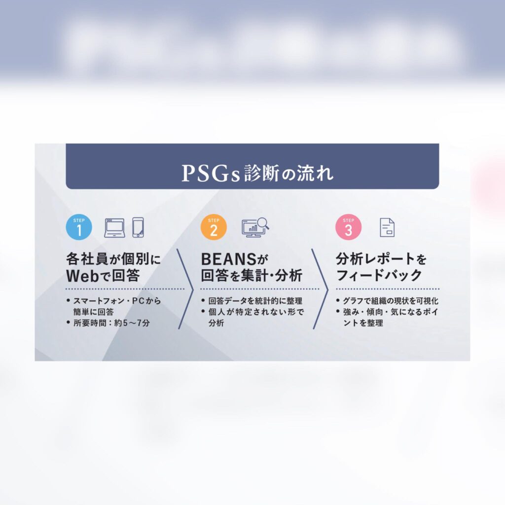企業ごとにさまざまな取り組みをしていらっしゃいます♪その取り組みの成果を定点観測するためのツールとしてPSGs診断を企画しました!